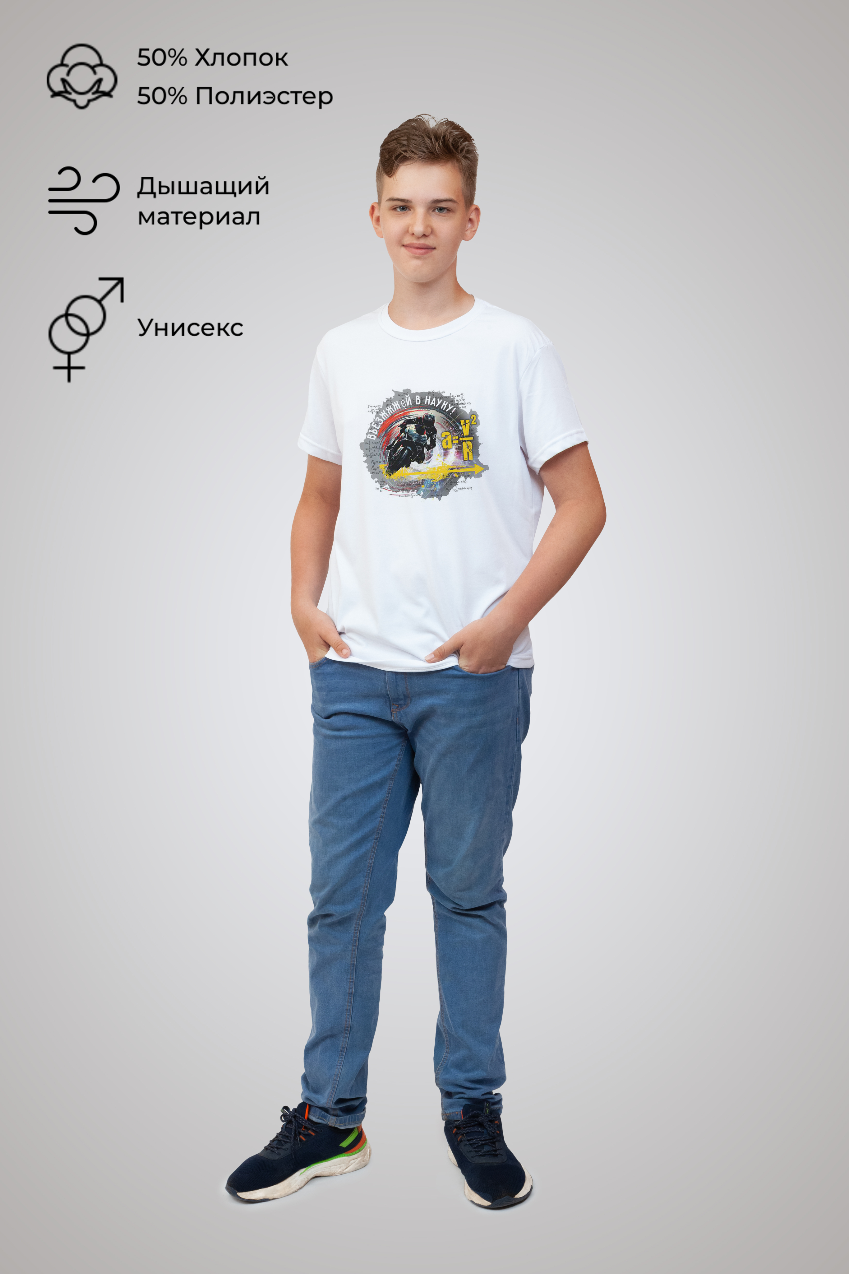 Базовое классическое изделие для мальчиков и девочек изготовлено из дышащего материала высокого качества российского производства, что делает его подходящим для любого сезона. Гипоаллергенный состав не вызывает раздражений даже на чувствительной коже. А плотность ткани обеспечивают комфорт и долговечность изделия. Состав изделия - 50% хлопок и 50% эластана. Футболка подойдёт для любого случая: прогулки, спорта, отдыха дома или на природе. Лицевая сторона украшена авторским принтом, изображающим спортивный мотоцикл и формулы. Он нанесён инновационным способом, что гарантирует яркость и долговечность изображения. Принт тактильно никак не ощущается на ткани, не трескается и сохраняет насыщенность даже после многочисленных стирок.