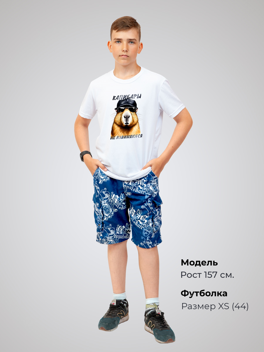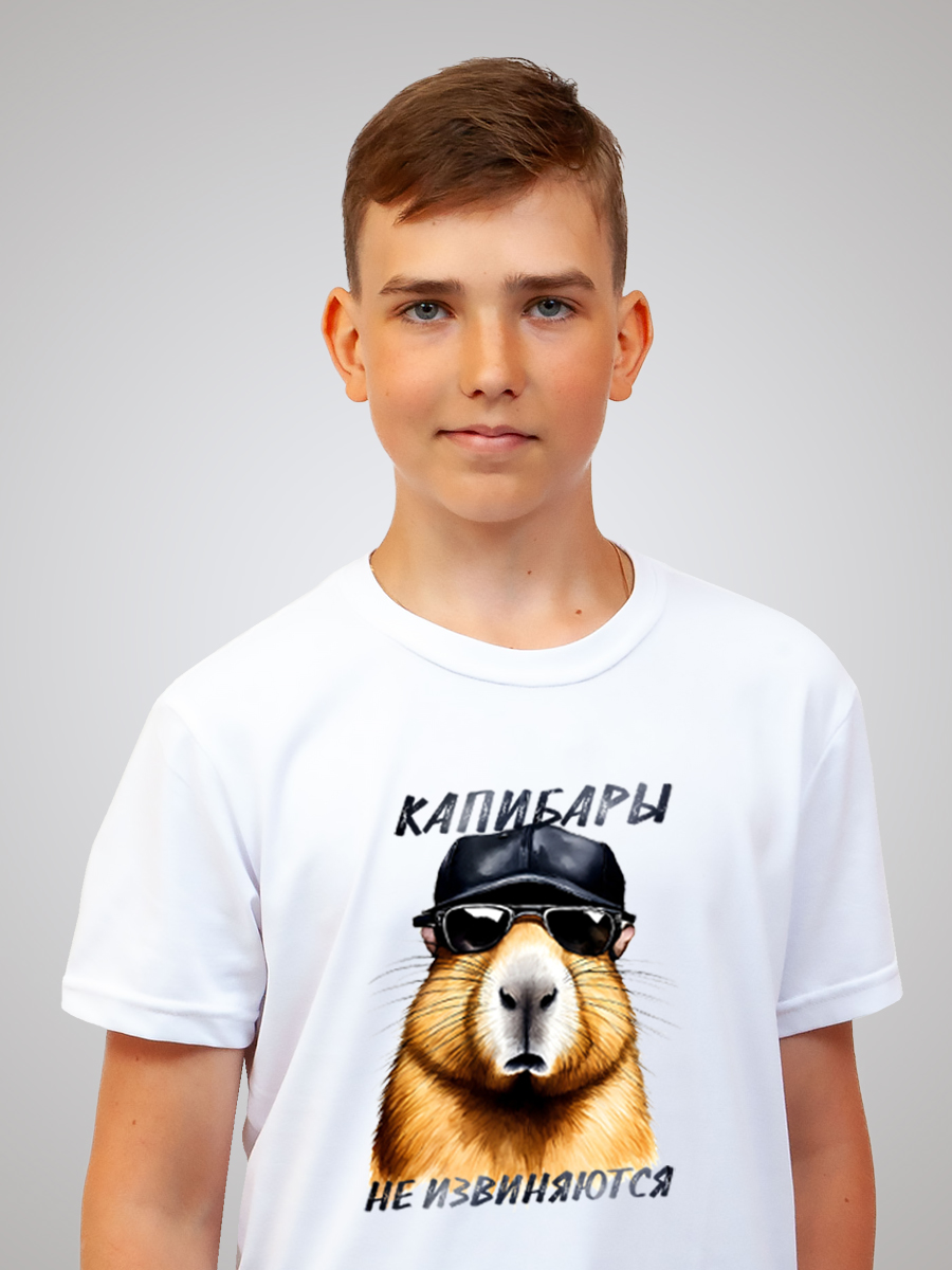 Базовое классическое изделие для мальчиков и девочек изготовлено из дышащего материала высокого качества российского производства, что делает его подходящим для любого сезона. Гипоаллергенный состав не вызывает раздражений даже на чувствительной коже. А плотность ткани обеспечивают комфорт и долговечность изделия. Состав изделия - 50% хлопок и 50% эластана. Футболка подойдёт для любого случая: прогулки, спорта, отдыха дома или на природе. Лицевая сторона украшена авторским принтом «Капибары не извиняются (Слово капибары)», который нанесён инновационным способом, что гарантирует яркость и долговечность изображения. Принт тактильно никак не ощущается на ткани, не трескается и сохраняет насыщенность даже после многочисленных стирок.