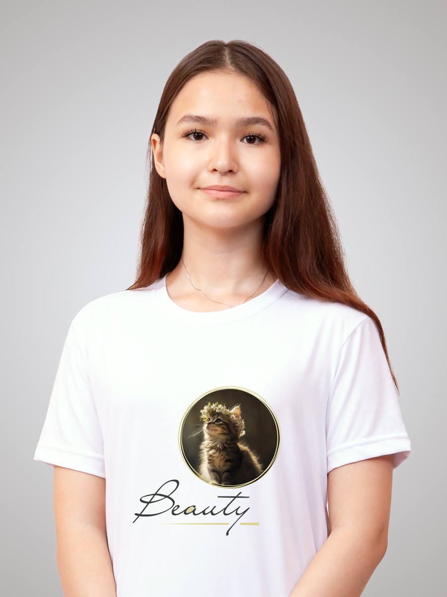 Гипоаллергенный состав не вызывает раздражений даже на чувствительной коже. А плотность ткани обеспечивают комфорт и долговечность изделия. Состав изделия - 50% хлопок и 50% эластана. Футболка подойдёт для любого случая: прогулки, спорта, отдыха дома или на природе. Лицевая сторона украшена авторским принтом с котенком «Beauty». Он нанесён инновационным способом, что гарантирует яркость и долговечность изображения. Принт тактильно никак не ощущается на ткани, не трескается и сохраняет насыщенность даже после многочисленных стирок. Отличный подарок любителю котиков, мемов и всего милого!