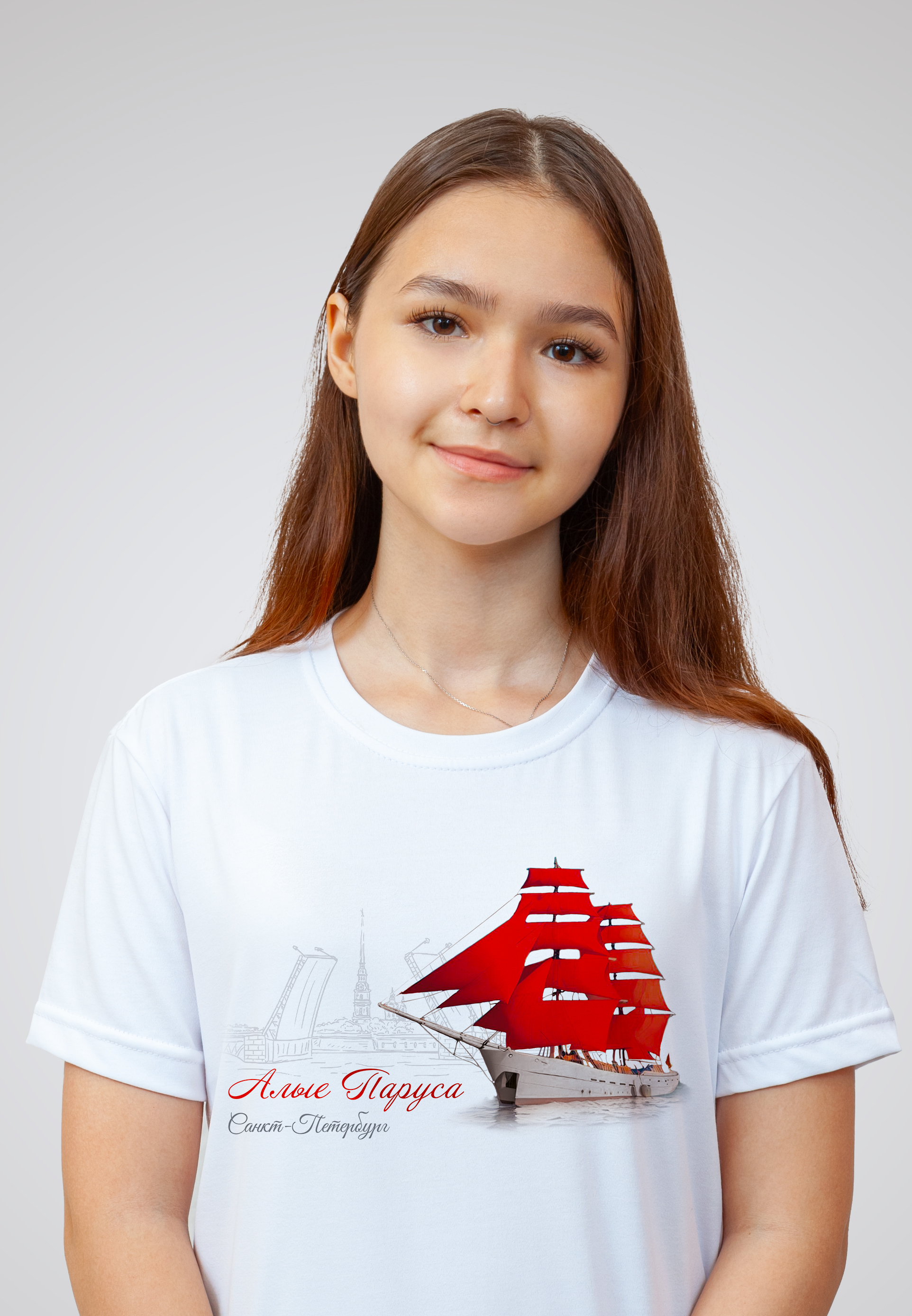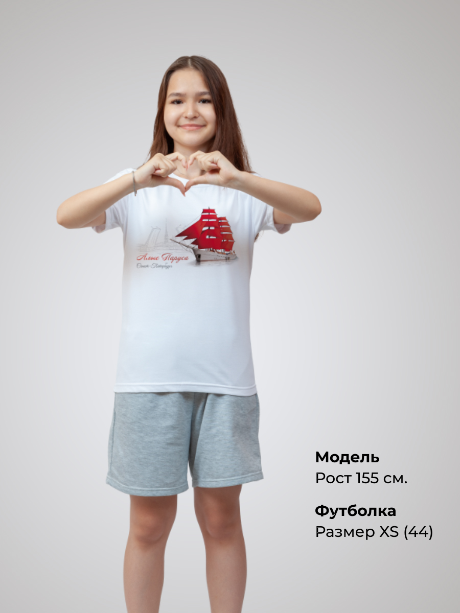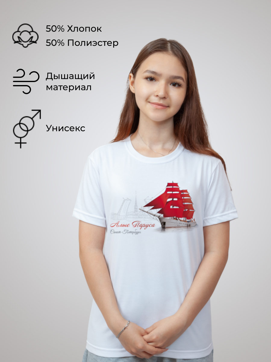 Состав изделия - 50% хлопок и 50% эластана. Футболка подойдёт для любого случая: прогулки, спорта, отдыха дома или на природе. Лицевая сторона украшена авторским принтом «Алые паруса» - символом питерского фестиваля выпускников, который нанесён инновационным способом, что гарантирует яркость и долговечность изображения. Принт тактильно никак не ощущается на ткани, не трескается и сохраняет насыщенность даже после многочисленных стирок. Уход за изделием прост: стирка, сушка и глажение без ограничений, отбеливание запрещено.