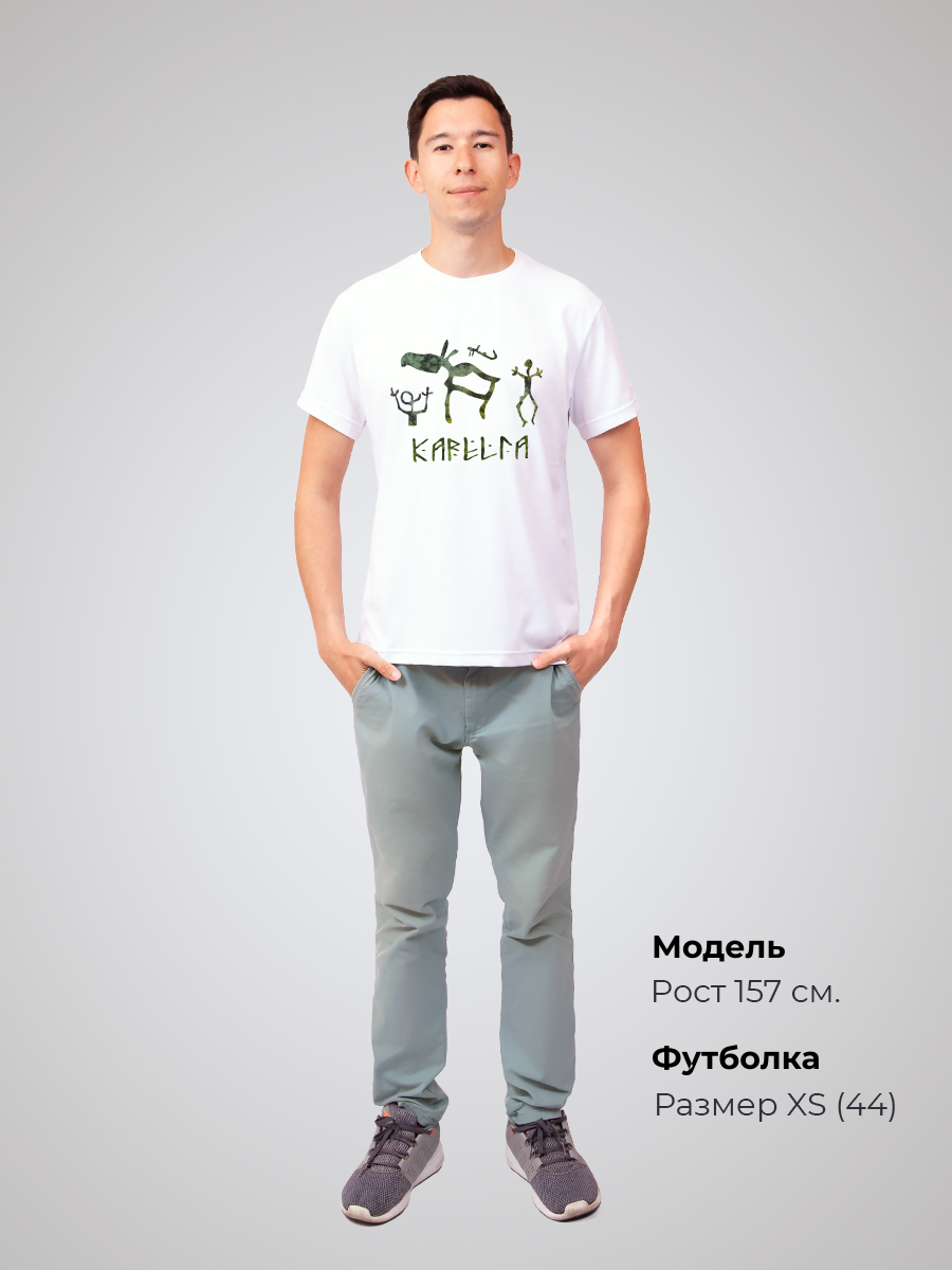 Гипоаллергенный состав не вызывает раздражений даже на чувствительной коже. А плотность ткани обеспечивают комфорт и долговечность изделия. Состав изделия - 50% хлопок и 50% эластана. Футболка подойдёт для любого случая: прогулки, работы, спорта, отдыха дома или на природе. Лицевая сторона украшена авторским принтом «Карелия», изображающим древние петроглифы. Он нанесён инновационным способом, что гарантирует яркость и долговечность изображения. Принт тактильно никак не ощущается на ткани, не трескается и сохраняет насыщенность даже после многочисленных стирок. Отличный подарок путешественнику и любителю истории!