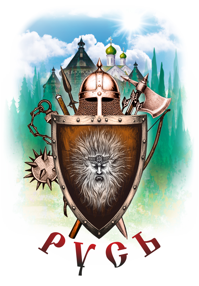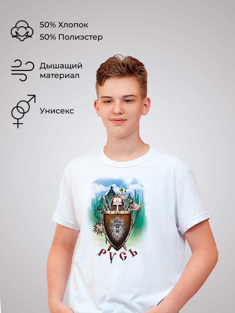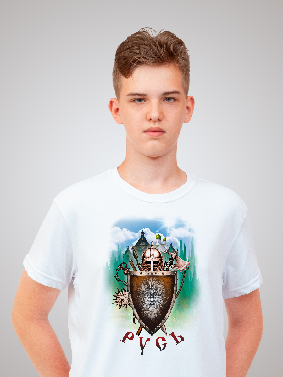 Состав изделия - 50% хлопок и 50% эластана. Футболка подойдёт для любого случая: прогулки, спорта, отдыха дома или на природе. Лицевая сторона украшена авторским принтом «Русь» с изображением щита, булавы, меча, топора, копий и стрел, который нанесён инновационным способом, что гарантирует яркость и долговечность изображения. Принт тактильно никак не ощущается на ткани, не трескается и сохраняет насыщенность даже после многочисленных стирок. Уход за изделием прост: стирка, сушка и глажение без ограничений, отбеливание запрещено.