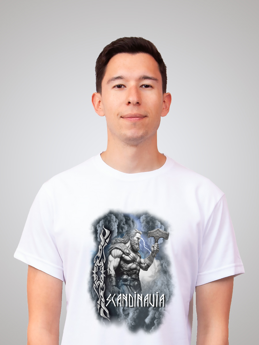 Базовое классическое изделие изготовлено из дышащего материала высокого качества российского производства, что делает его подходящим для любого сезона. Гипоаллергенный состав не вызывает раздражений даже на чувствительной коже. А плотность ткани обеспечивают комфорт и долговечность изделия. Состав изделия - 50% хлопок и 50% эластана. Футболка подойдёт для любого случая: прогулки, работы, спорта, отдыха дома или на природе. Лицевая сторона украшена авторским брутальным принтом изображающим скандинавского бога Тора. Принт нанесён инновационным способом, что гарантирует яркость и долговечность изображения. Принт тактильно никак не ощущается на ткани, не трескается и сохраняет насыщенность даже после многочисленных стирок. Отличный подарок любителю скандинавской мифологии!