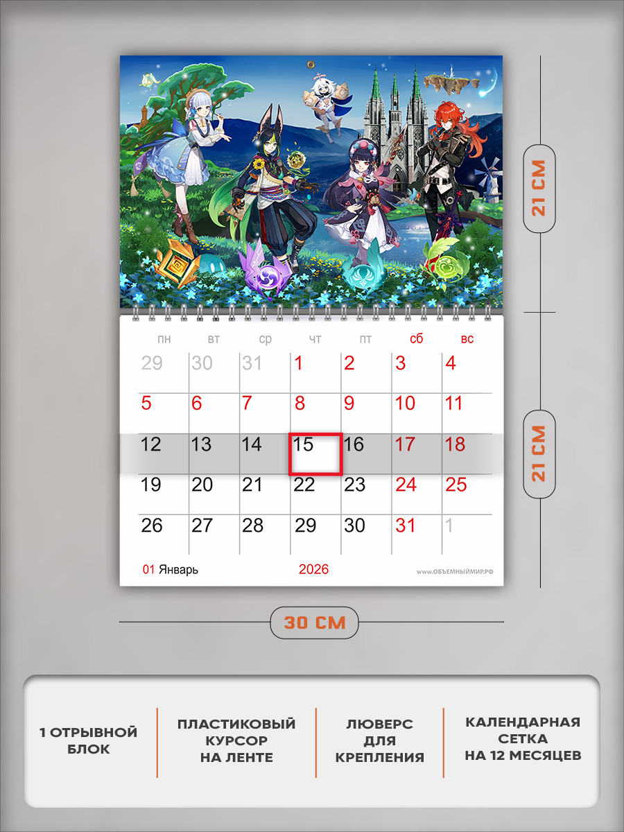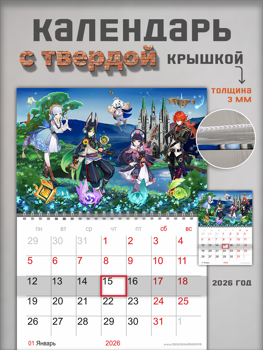 На этом изделии изображены персонажи компьютерной игры "Геншин Импакт". Это отличный подарок и ребенку, и взрослому игроману, с помощью которого он сможет отслеживать важные и ответственные события.