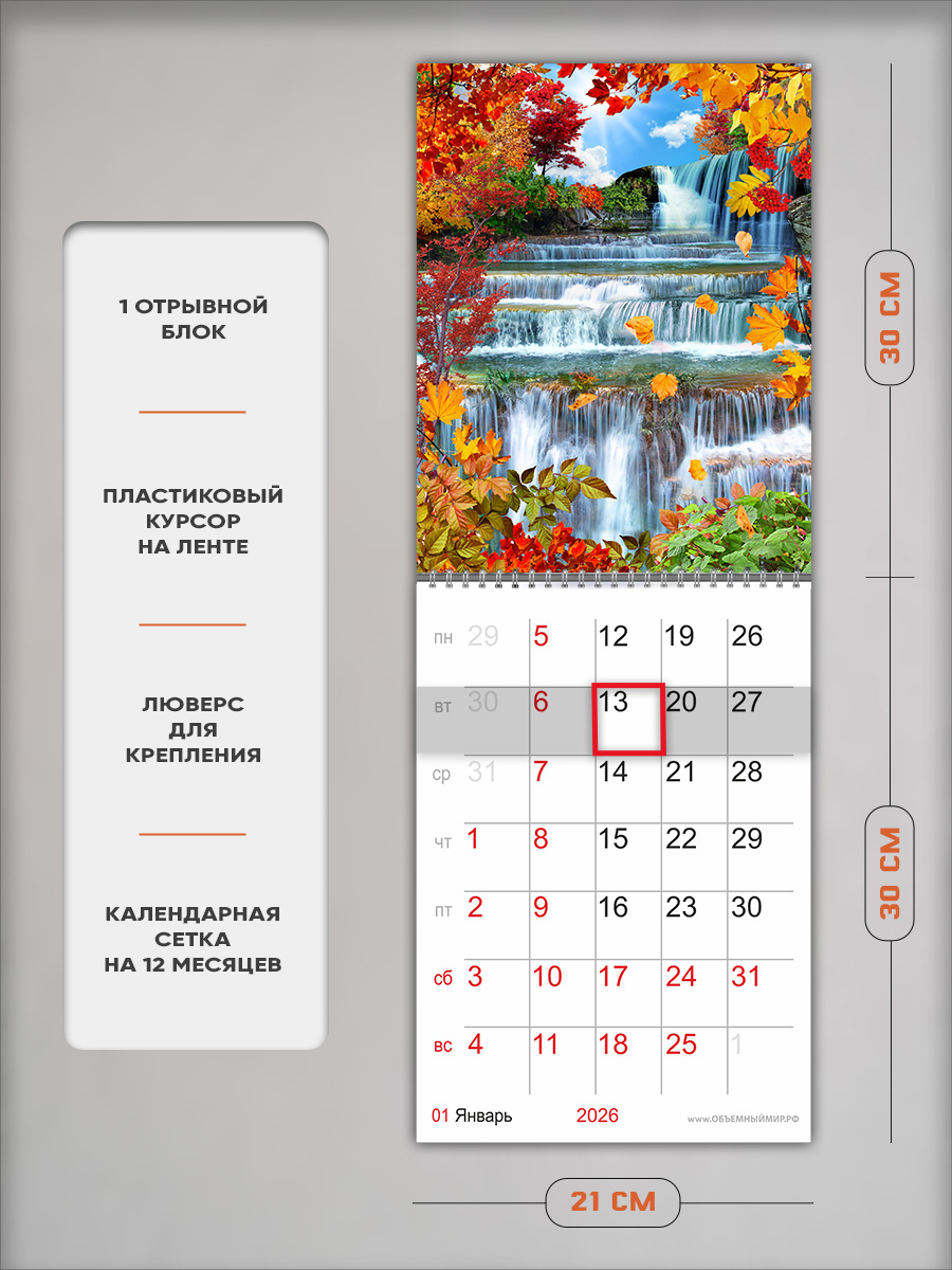 На этом изделии изображены виды водопада, на который падает золотистая осенняя листва. Это отличный подарок и ребенку, и взрослому любителю природы, с помощью которого он сможет отслеживать важные и ответственные события.
