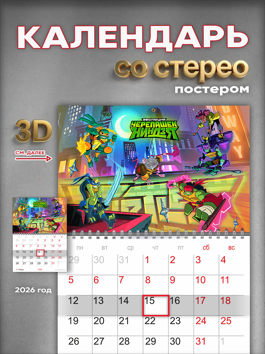 Настенный отрывной стереокалендарь c 3D-эффектом "Черепашки-ниндзя"