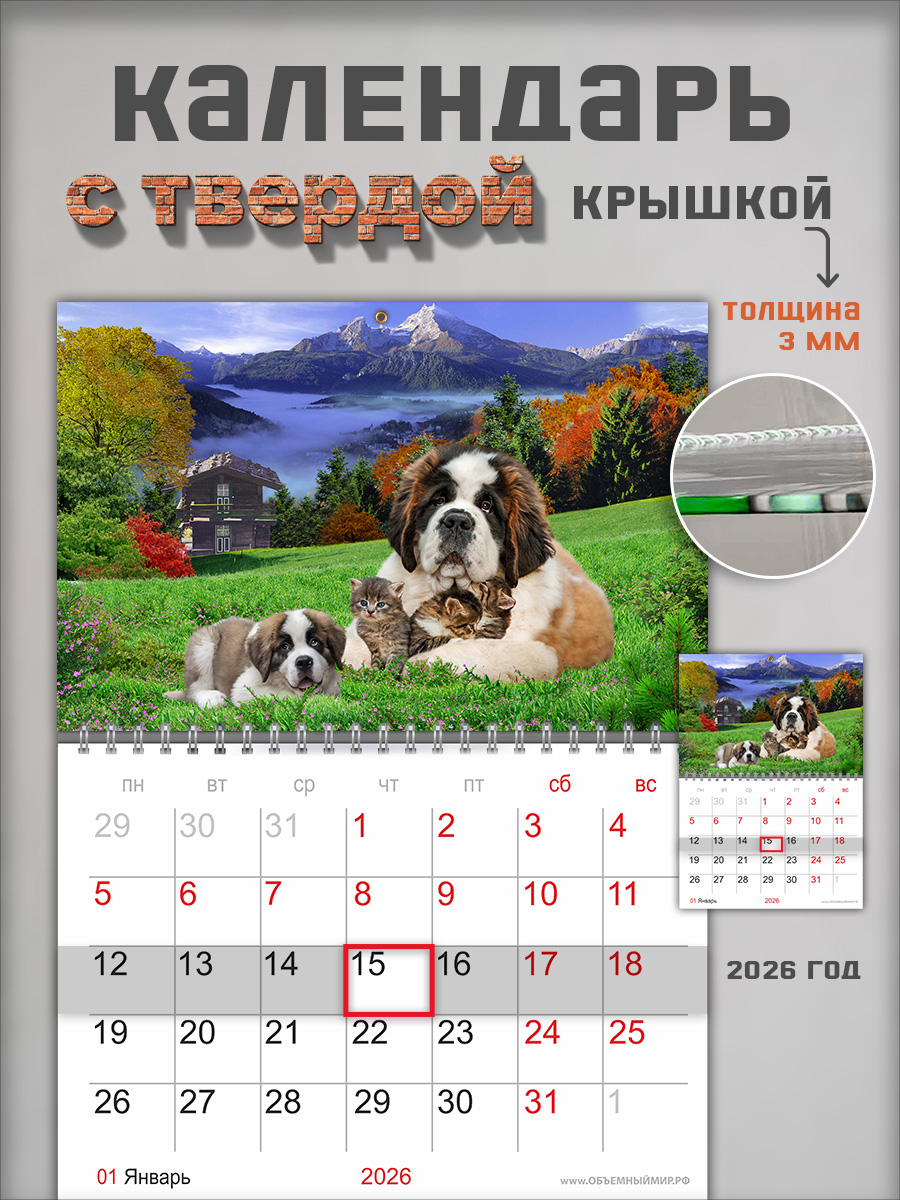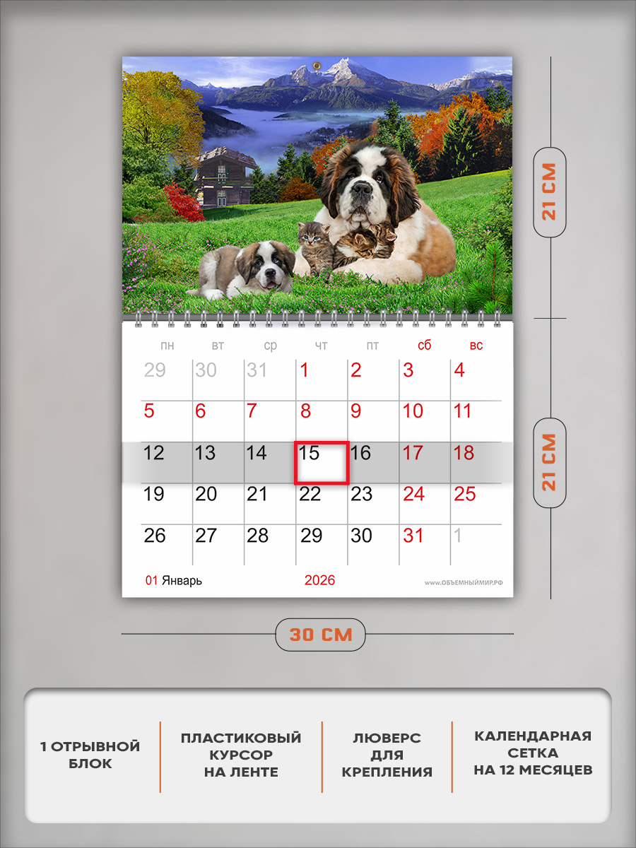 На этом изделии изображены преданные собаки - сенбернары. Это отличный подарок и ребенку, и взрослому любителю природы, с помощью которого он сможет отслеживать важные и ответственные события.