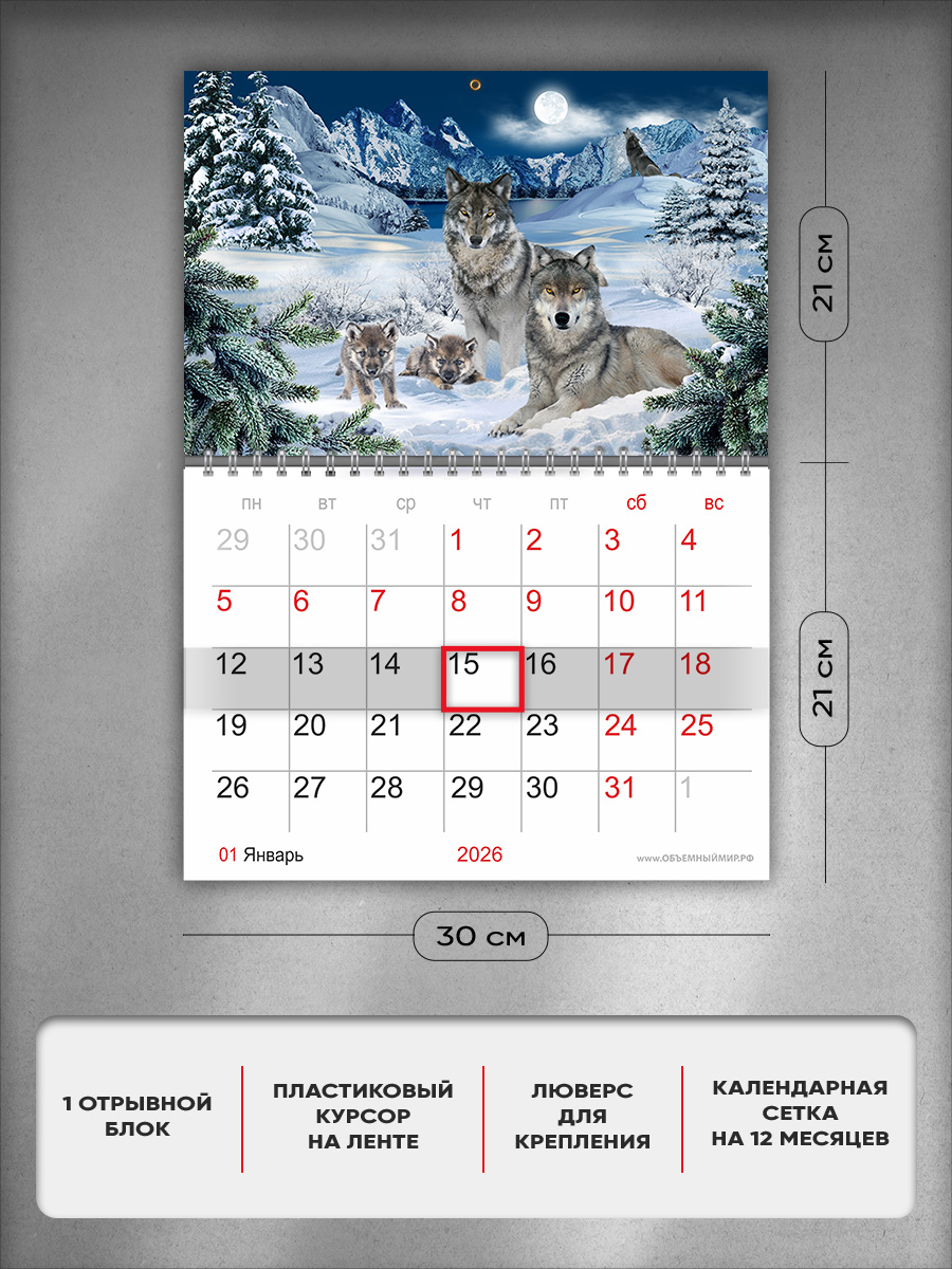 На этом изделии изображены волки на фоне зимнего пейзажа. Это отличный подарок ребенку, с помощью которого он сможет отслеживать важные и ответственные события, и взрослому любителю живой природы.