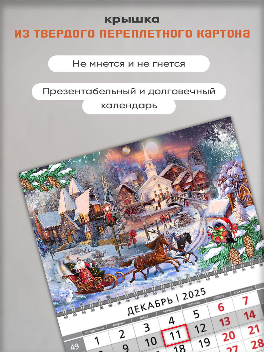 На этом изделии изображены лошади - символы года и Дед Мороз в уютной зимней атмосфере. Это отличный подарок как взрослому, так и ребенку, с помощью которого он сможет отслеживать важные и ответственные события.