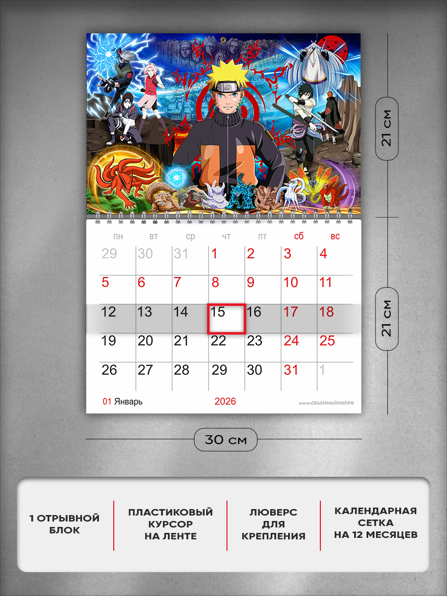 На этом изделии изображены персонажи аниме Naruto. Это отличный подарок ребенку, с помощью которого он сможет отслеживать важные и ответственные события, и взрослому любителю японской мультипликации