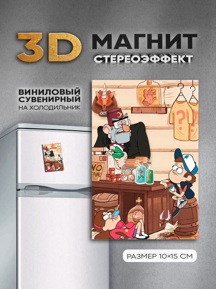 Добавьте изюминку в интерьер кухни, офиса или детской комнаты с нашим стереомагнитом! Этот стильный аксессуар, изображающий мультперсонажей сериала "Гравити Фолз", не только украсит холодильник, магнитную доску или шкафчик, но и подарит моменты радости — изображение обладает 3D-эффектом, который видно без специальных очков.