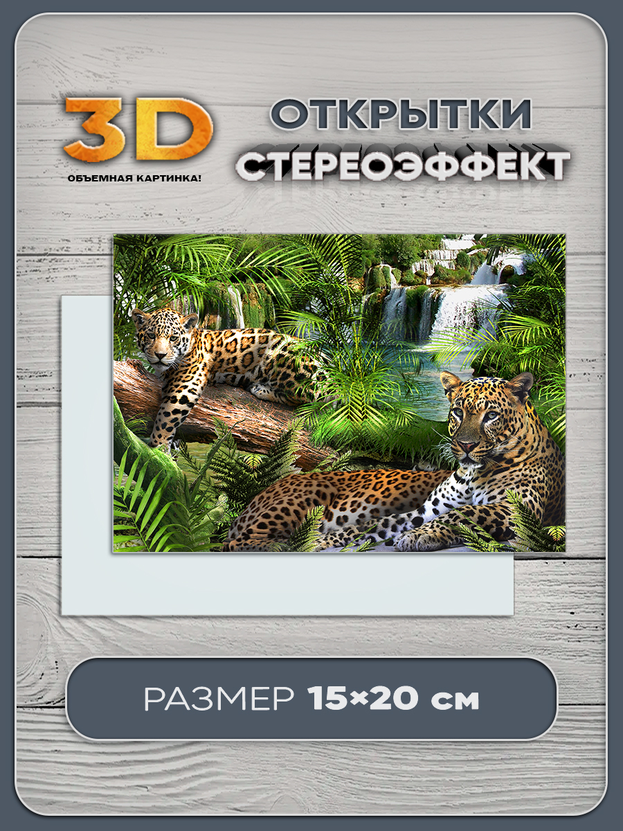 Стереооткрытка — уникальный подарок. Это необычный 3D-сувенир, который создаёт эффект объёмного изображения без очков. На нем изображены леопарды - грациозные пятнистые хищники.