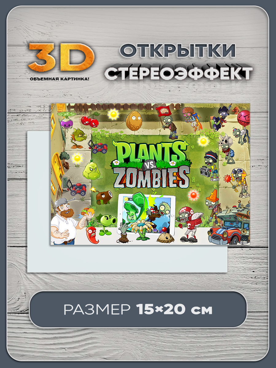 Стереооткрытка — уникальный подарок. Это необычный 3D-сувенир, который создаёт эффект объёмного изображения без очков. На нем изображены персонажи компьютерной игры Plants vs. Zombies.
