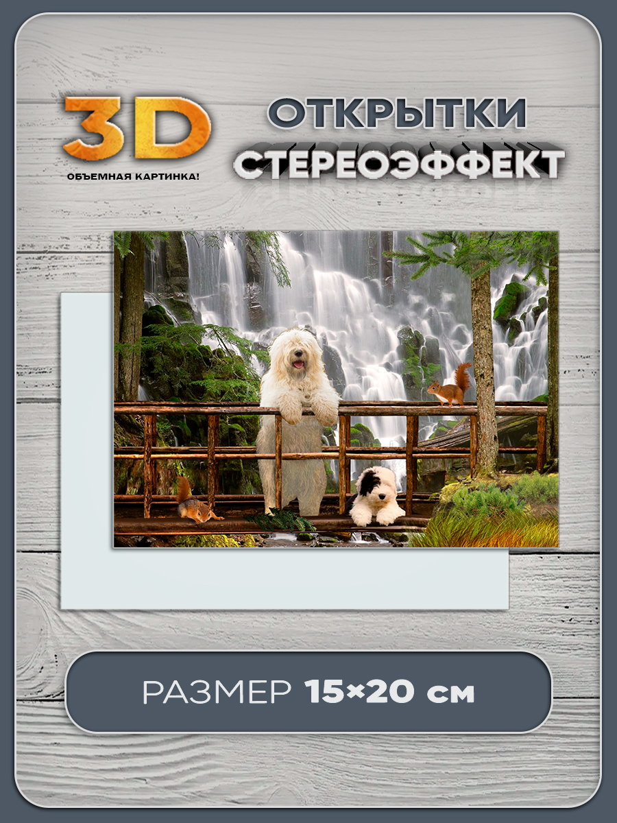 Стереооткрытка — уникальный подарок. Это необычный 3D-сувенир, который создаёт эффект объёмного изображения без очков. На нем изображены мохнатые собаки на фоне водопада.