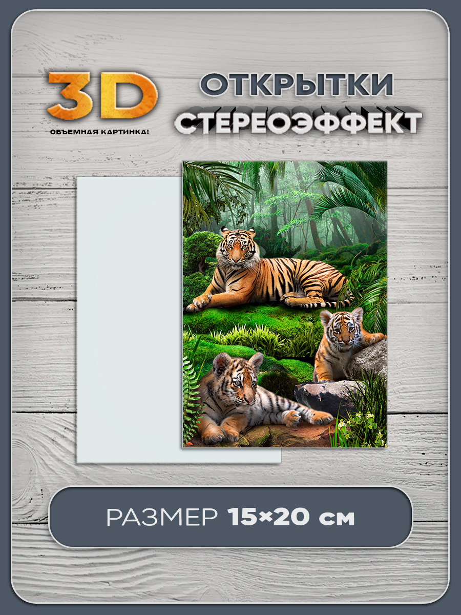 Стереооткрытка — уникальный подарок. Это необычный 3D-сувенир, который создаёт эффект объёмного изображения без очков. На нем изображены тигрята - грациозные полосатые звери.