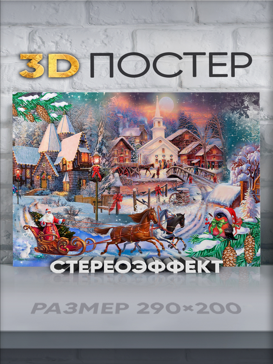 Постер, изображающий Деда Мороза, едущего на тройке лошадей, и пейзажи зимнего городка, задаст тон интерьеру и каждый день будет радовать глаз. Идеально для тех, кто ценит выразительные акценты в дизайне.